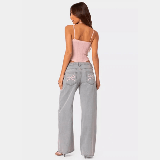 Broderet Lyserød Sløjfe Baggy Jeans Dame - Denim - Streetwear - Lige
