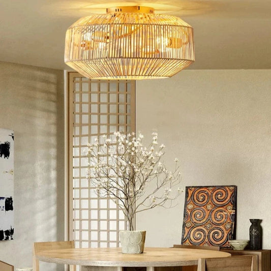 Rattan Loftventilator med Lys - Boho - Vævet Bambus - ABS Ventilatorblad