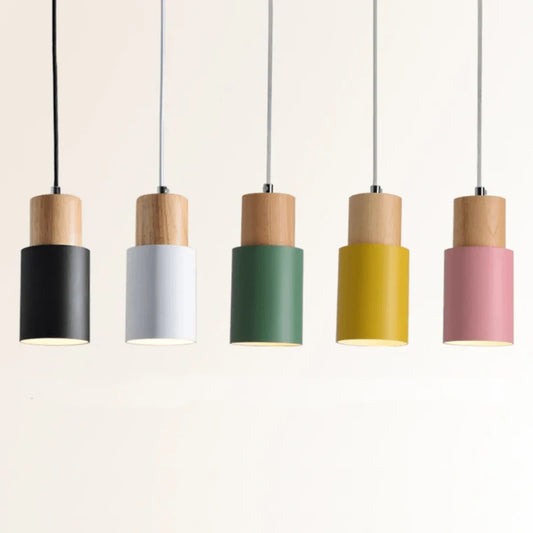 Massivt Træ Metal Cylinder Pendel Lampe - E27 - LED - Ø 10cm